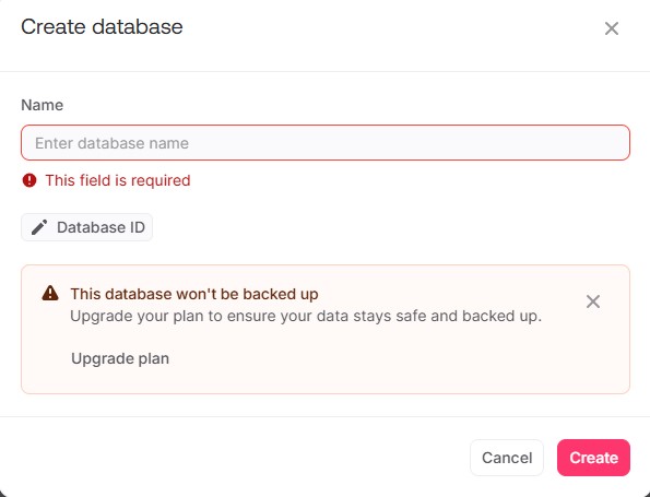 3 - Now enter database name of your own choice. (Optionally, add a custom database ID or go without adding custom one) and click on create button. It will create a database having unique database ID.